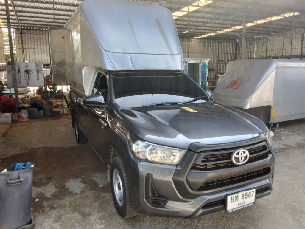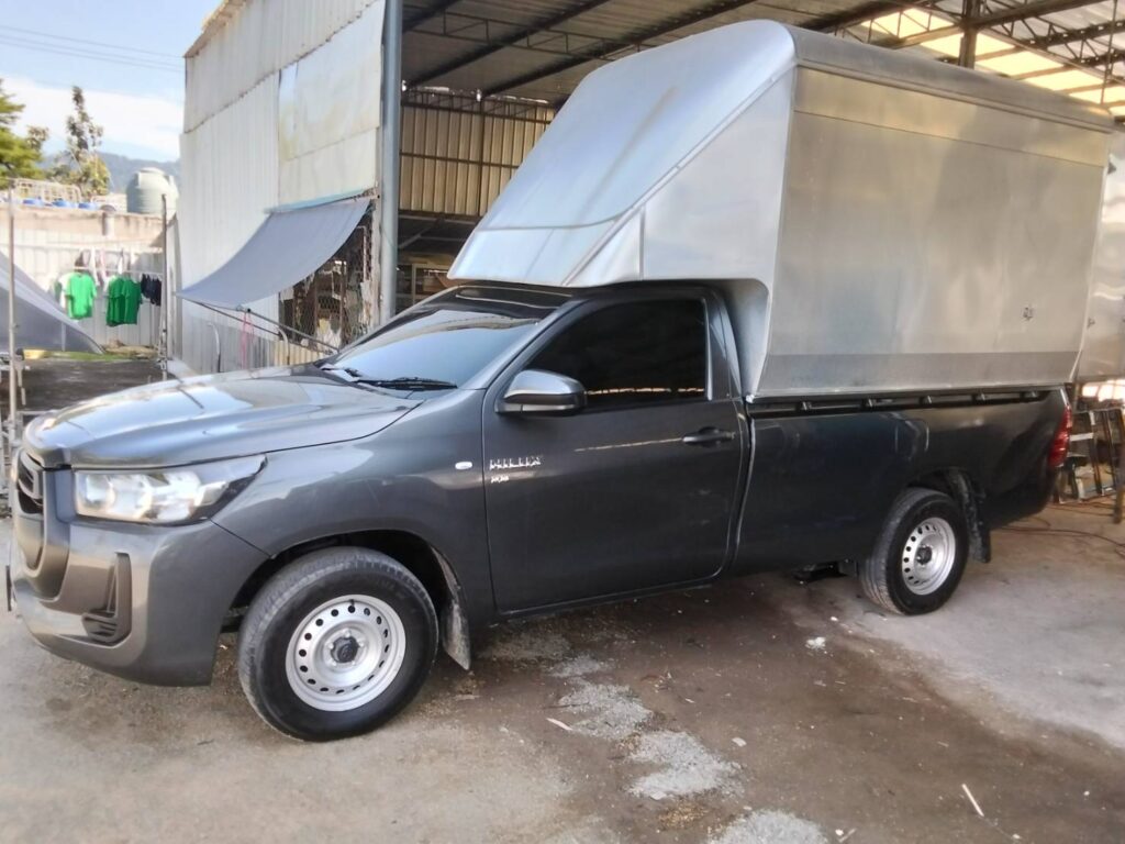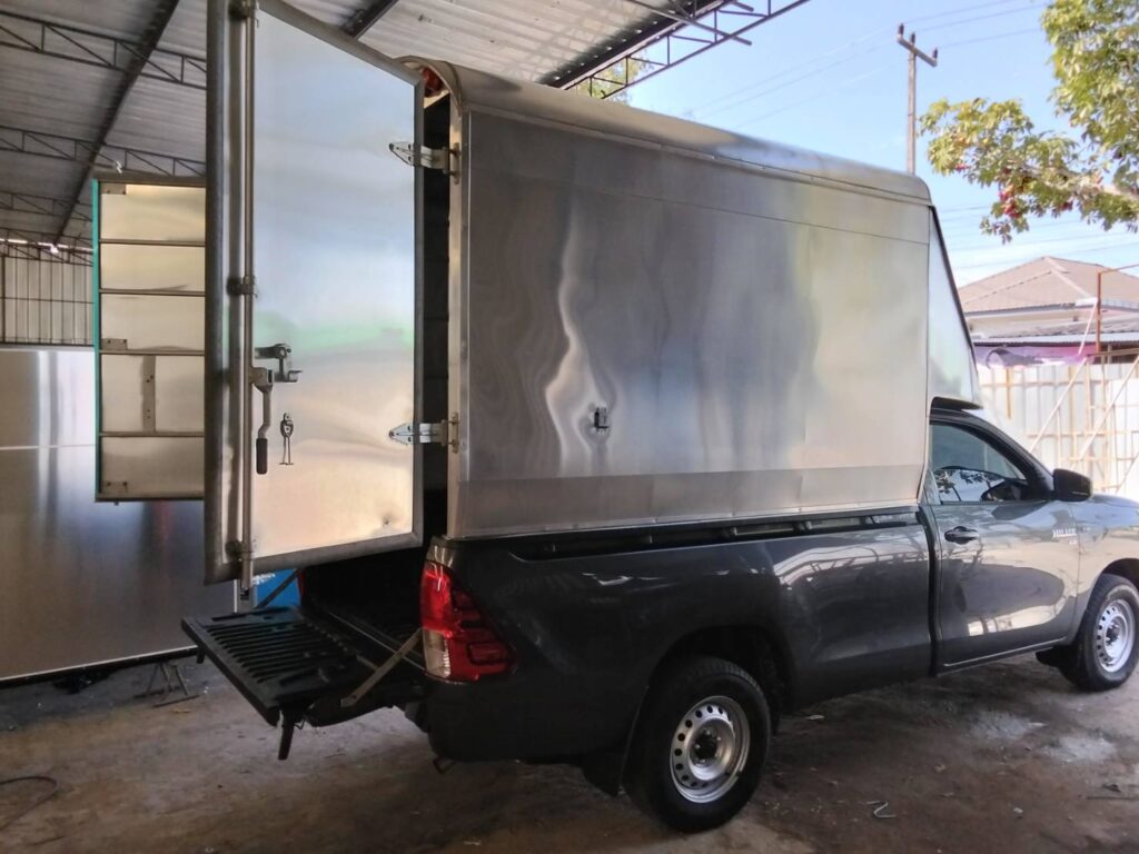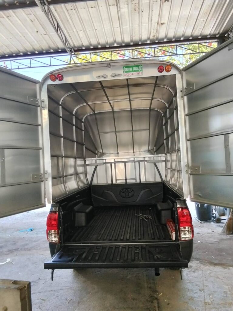 หลังคาตู้ทึบ สูง 2.10 เมตร จากพื้นกระบะ หรือ 2.95 เมตร จากพื้นดิน ประตูท้ายเปิด 2 บาน ขนของได้ทุกประเภท กันแดด ฝน น้ำ ลม ฝุ่น เหมาะกับงานขนส่ง สินค้าจำนวนมาก หลังคาน้ำหนักเบามาก 150 กิโลกรัม