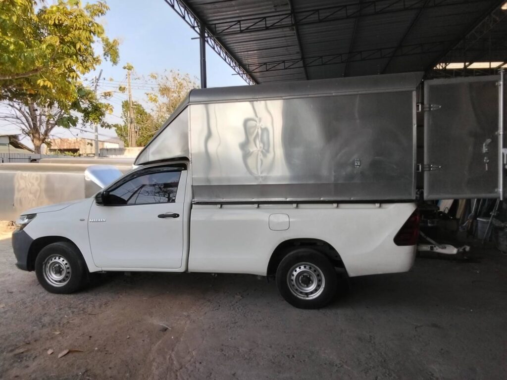 ตู้ทึบอลูมิเนียม หลังคารถกระบะความสูง 2.10 เมตร ตู้ทึบ หลังคาตู้ทึบ หลังคาด้านบนเป็นทรงเหลี่ยม ติดตั้งกับรถกระบะตอนเดียว ความสูงของหลังคา 2.10 เมตร วัดจากพื้นกระบะถึงบนสุดของหลังคา ด้านในบุด้วยโฟมและบุทับด้วยไม้อัดอีกรอบ ลูกค้าใช้งานแบบป้องกันความร้อน บุป้องกันความร้อนรอบคัน…
