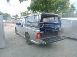 หลังคาสองแถวทรงเตี้ยโครงสร้างเป็นเหล็กแป๊บขนาด1/2 นิ้ว ทำสีรองพื้น ทำสีขาวหุ้มหลังคาด้วยแผ่นสแตนเลสเกรด 430 หนา 0.50 มิลลิเมตรความสูงของหลังคา 1.40 เมตร จากพื้นกระบะ หรือ 2.10 เมตรจากพื้นดินพนักพิงซ้าย ขวาราวกันตกท้าย ...