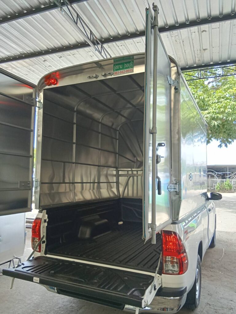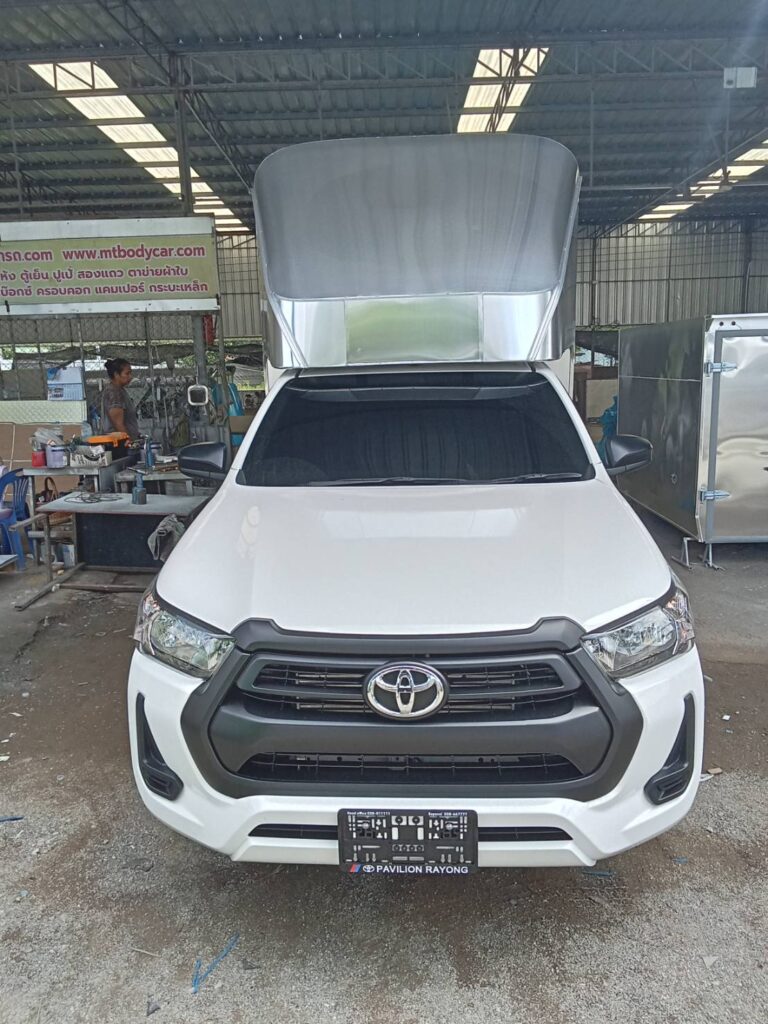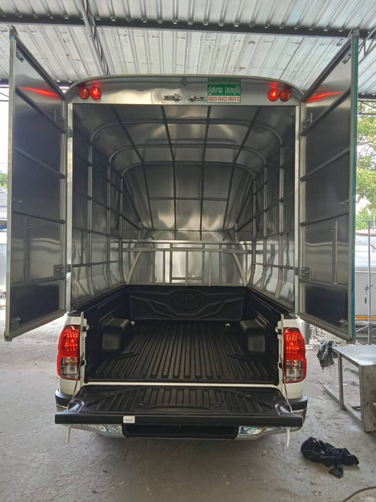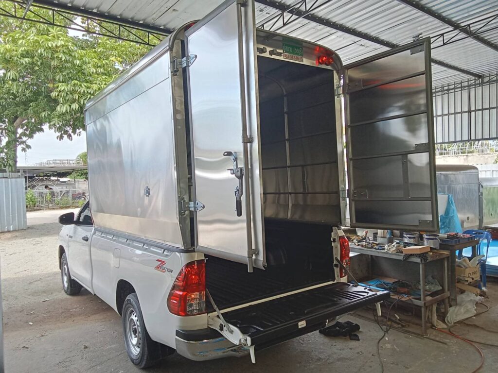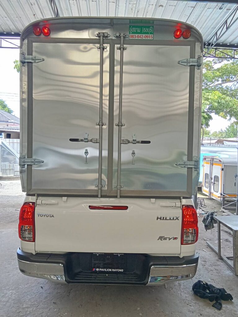 ตู้ทึบหลังคารถกระบะ ช่วงยาว สูงจากพื้นดิจ 2.80 เมตร และสูงจากพื้นกระบะรถ 2.10 เมตร โครงสร้างทั่วไปเป็นเหล็กแป้บทำสีบรอนด์ หุ้มด้านนอกด้วยแผ่นอลูมิเนียมหนา 0.70 มิลลิเมตร ไม่บุด้านใน ประตูท้ายเปิดออกด้านข้าง ซ้าย ขวา ไฟท้ายตู้ตามขนส่งกำหนด เป็นไฟหลี่ ไฟเลี้ยว ผลิตตามความต้องการของลูกค้า ติดตั้งกับรถกระบะ โตโยต้า รีโว่ ตอนเดียว
