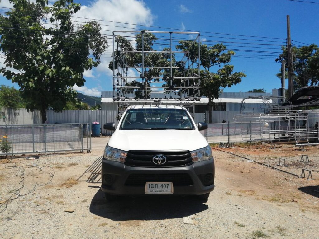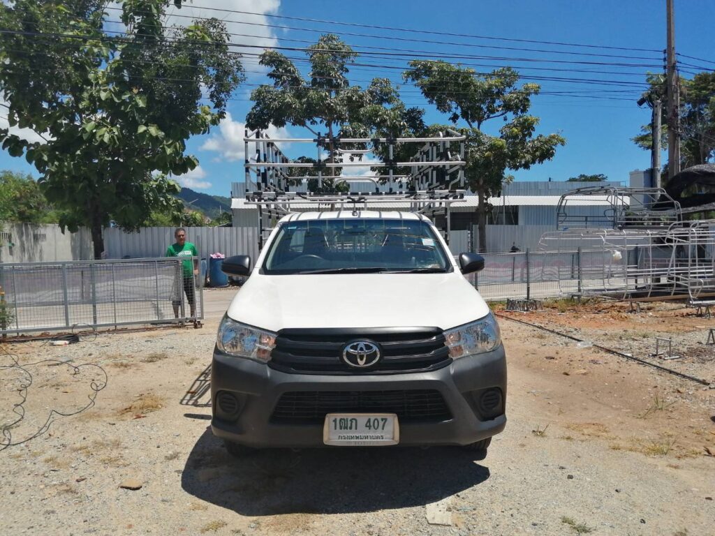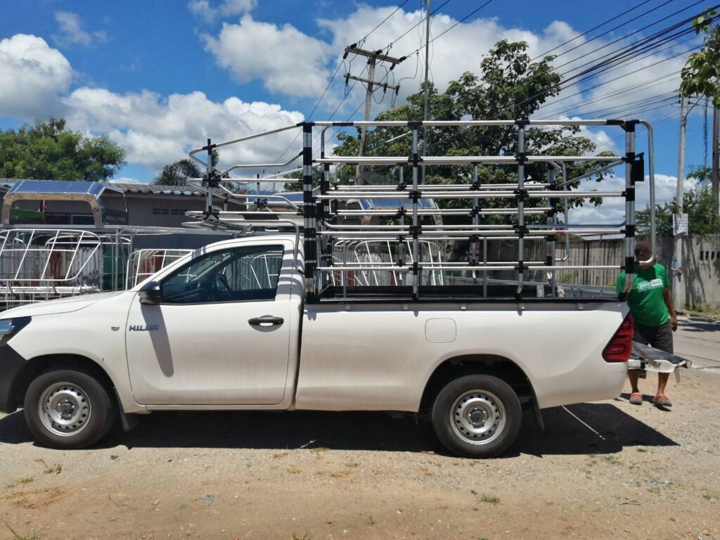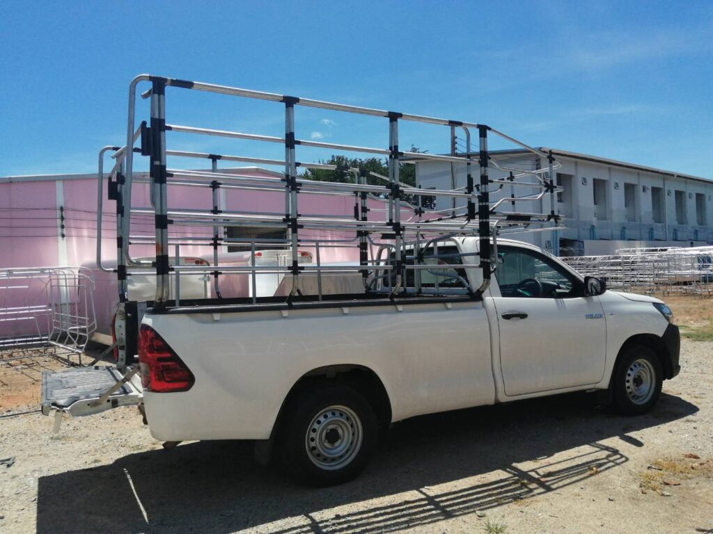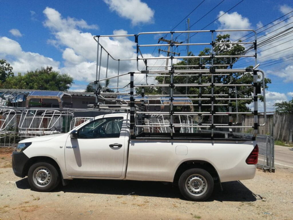 คอกประปาแซมเลส ความสูง 1.35 เมตร คอกประปา คอกบรรทุก คอกประปาแซมเลส สูง 1.35 เมตร เสียบท้ายทรงย้อย กลอนล๊อคฝาท้ายสแตนเลส ติดตั้งกับรถกระบะตอนเดียว เสริมแหนบ เพลาลอย ล้อบรรทุก