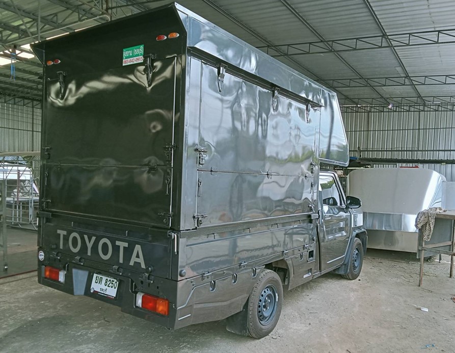 hilux champe ตู้ทึบ 1.80 เมตร hilux champ, ไฮลักซ์แชมป์ ความสูงของหลังคาวัดความสูงจากพื้นกระบะถึงบนสุด 1.80 เมตร โครงสร้างเป็นเหล็กแป๊บดำทำสีบรอนด์ วัสดุหุ้มภายนอกเป็นแผ่นอลูมิเนียมเกรด 1100 หนา 0.70 มิลลิเมตร ประตูท้ายเปิดออกข้าง…