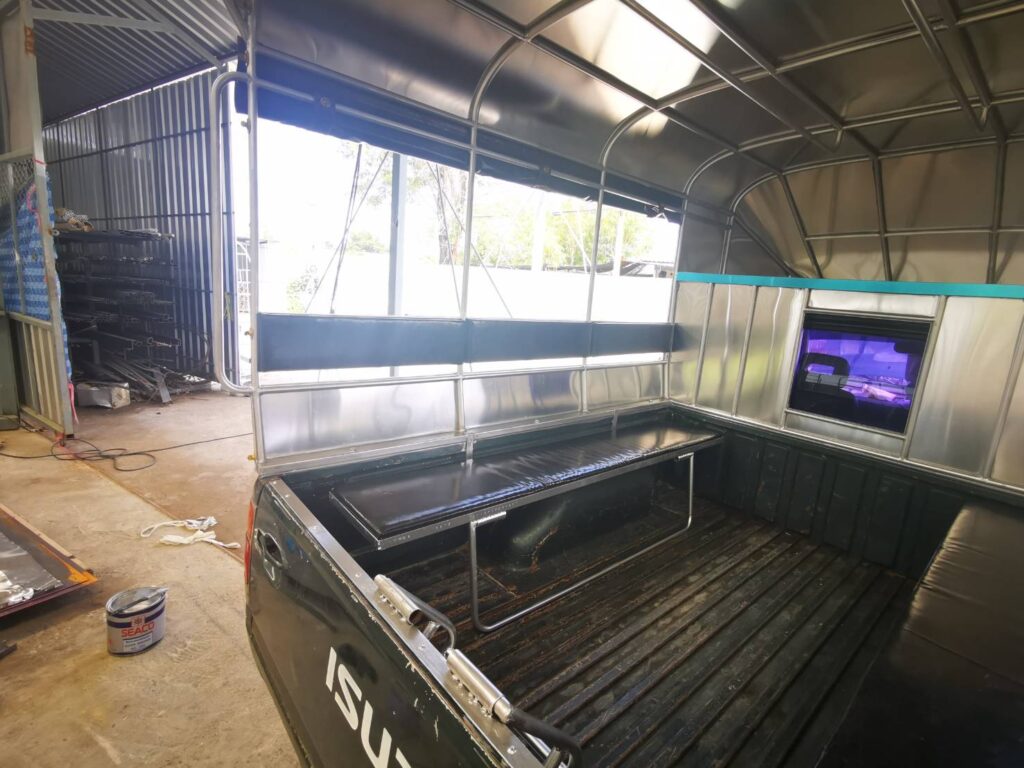 หลังคาสองแถวทรงสูง หัวยื่นไปถึงหน้ากระจก รถกระบะช่วงยาว