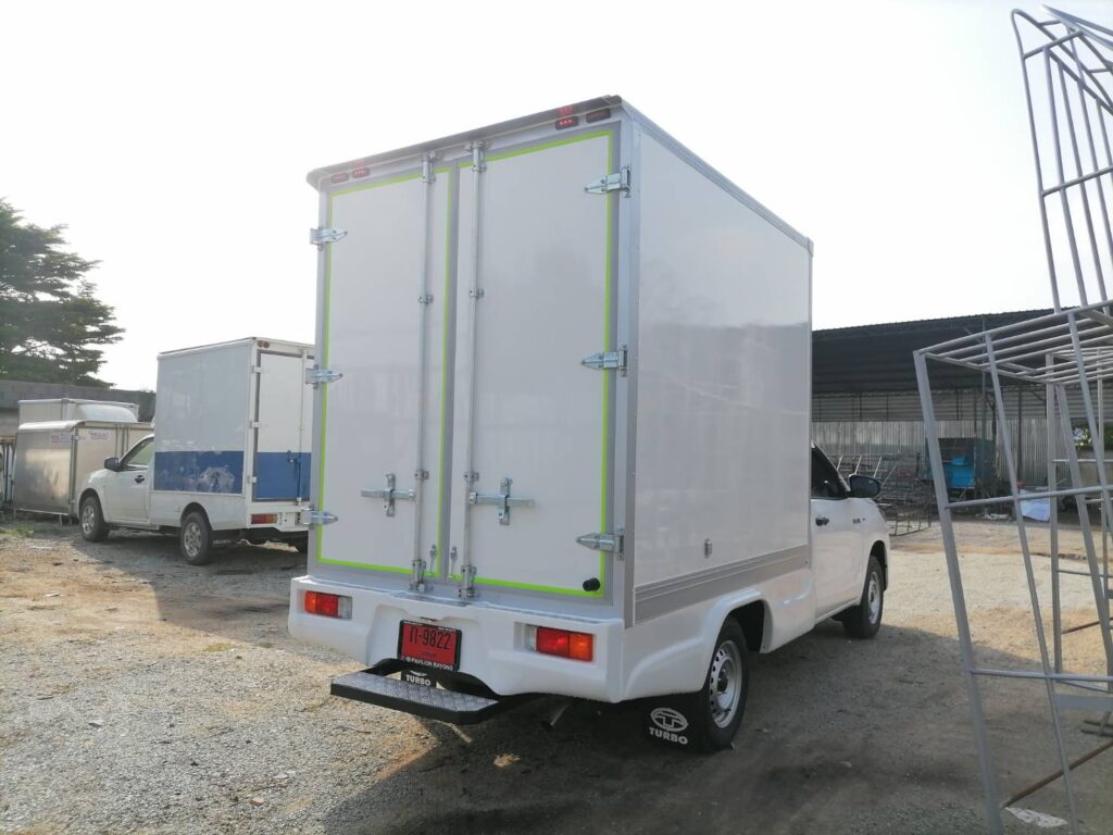 โครงสร้างเป็นเหล็กแป๊บป้องกันสนิม วัสดุบุหุ้มด้านนอกและในด้วยแผ่นอลูมิเนียม และโฟมฉนวนกันความร้อน หมวกลูลมด้านหน้าเป็นไฟเบอร์ ประตูท้ายเปิดออกข้าง 2 บาน ซ้าย ขวา ล็อคด้วยเขี้ยวคู่ขนาน ไฟท้ายเป็นไฟหลี่ และไฟเลี้ยว ด้านอกและในเป็นสีขาว ***บุพื้นด้วยวัสดุแผ่นอลูมิเนียมแผ่นลายป้องกันน้ำเข้า