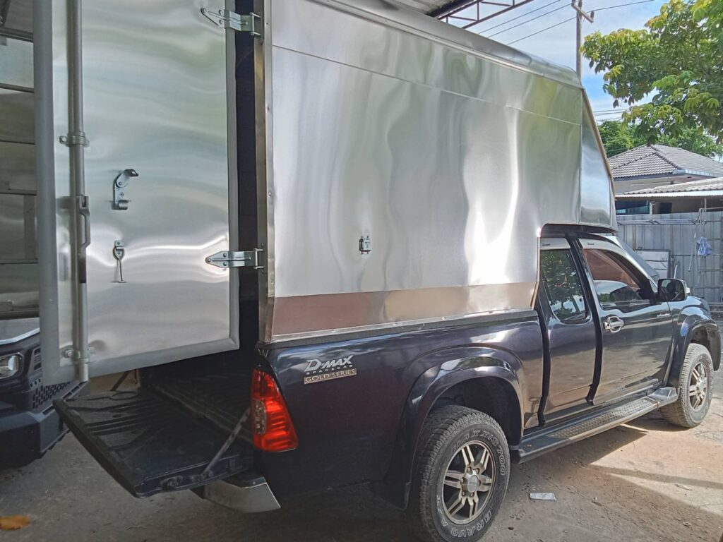 ตู้ทึบอลูมิเนียม หลังคารถกระบะความสูง 2.10 เมตร ตู้ทึบ หลังคาตู้ทึบ หลังคาด้านบนเป็นทรงเหลี่ยม ติดตั้งกับรถกระบะตอนเดียว ความสูงของหลังคา 2.10 เมตร วัดจากพื้นกระบะถึงบนสุดของหลังคา ด้านในบุด้วยโฟมและบุทับด้วยไม้อัดอีกรอบ ลูกค้าใช้งานแบบป้องกันความร้อน บุป้องกันความร้อนรอบคัน…