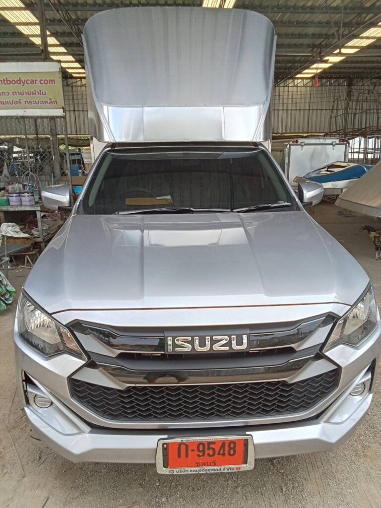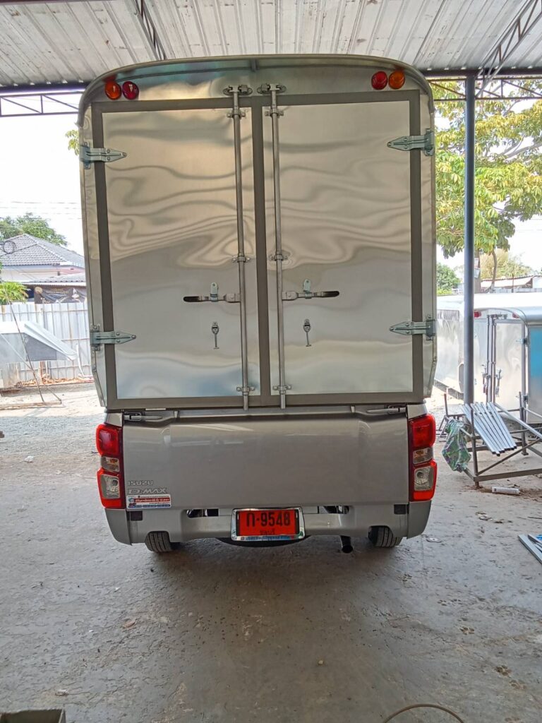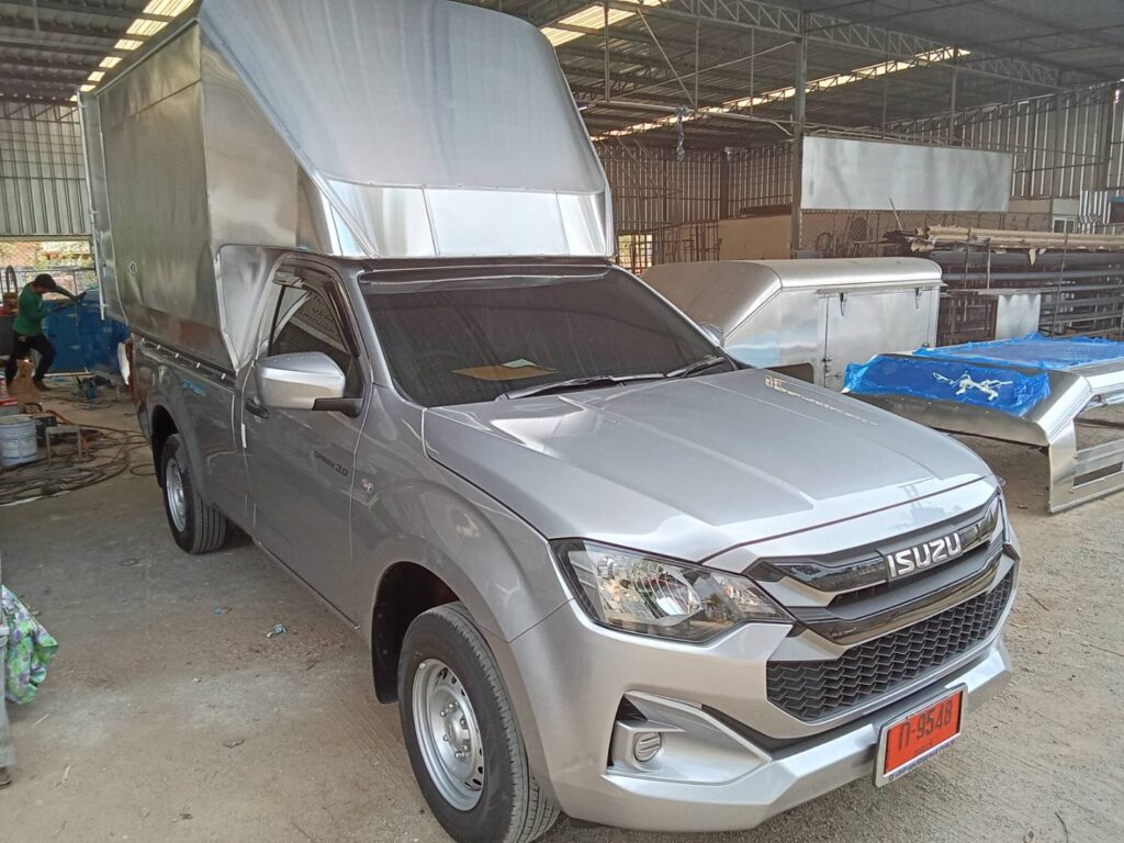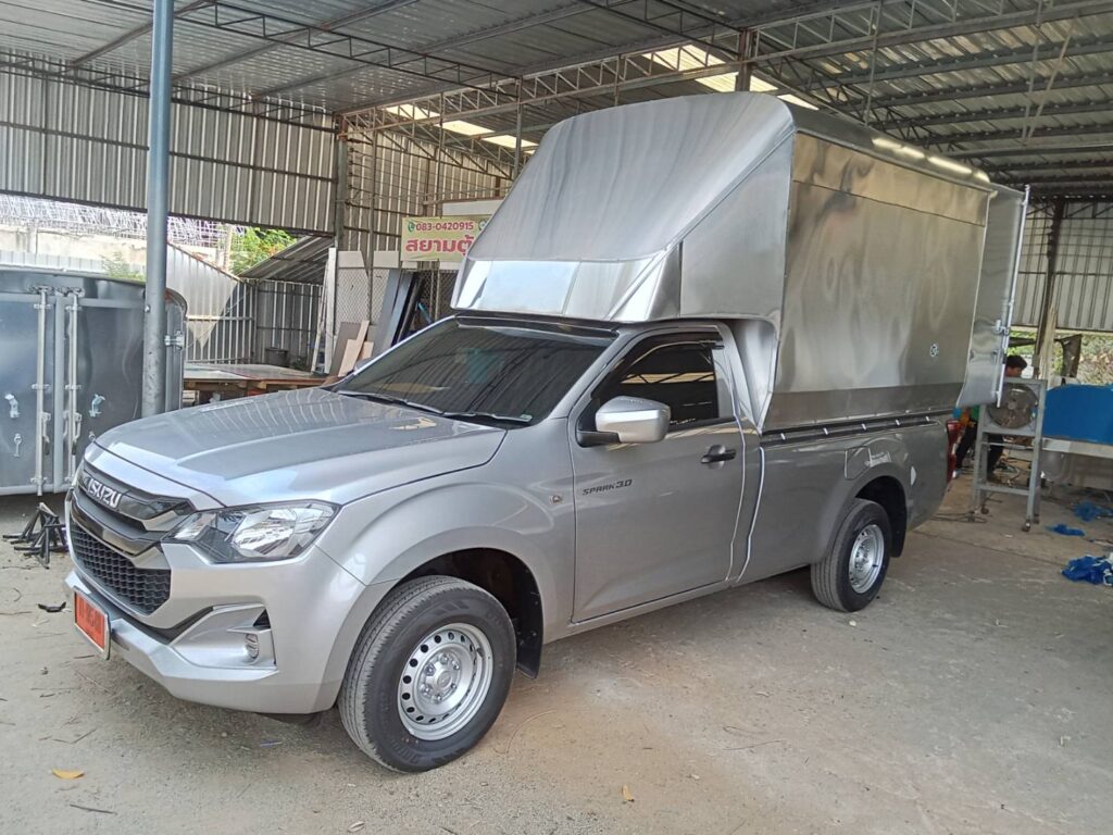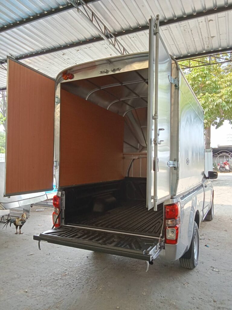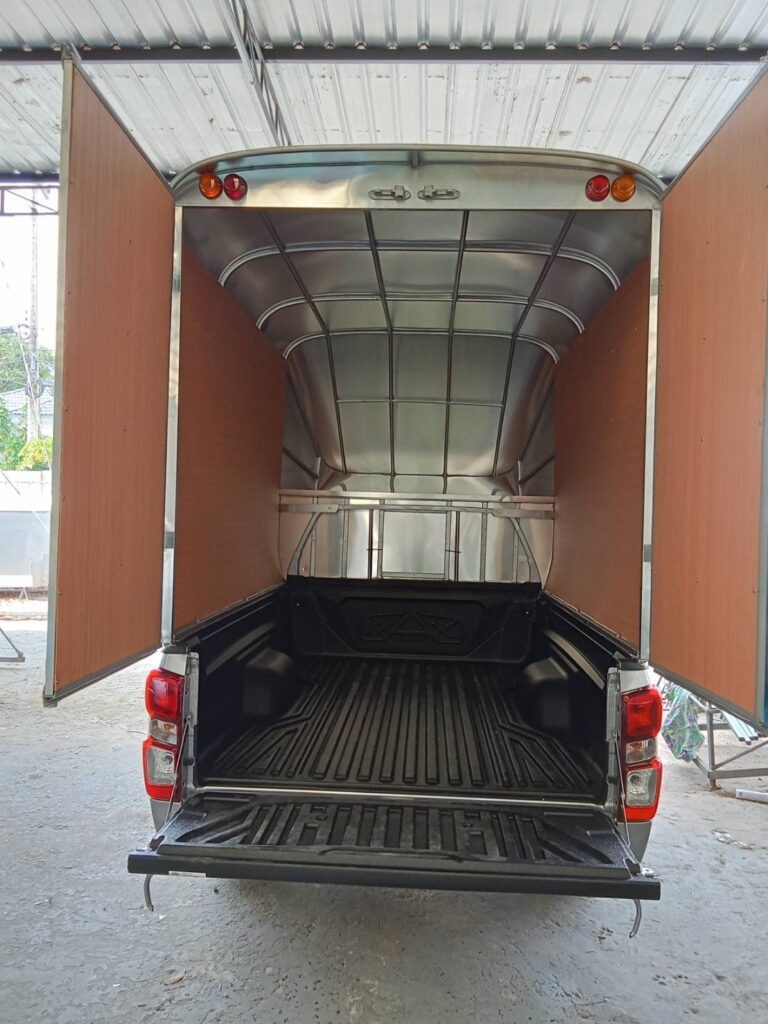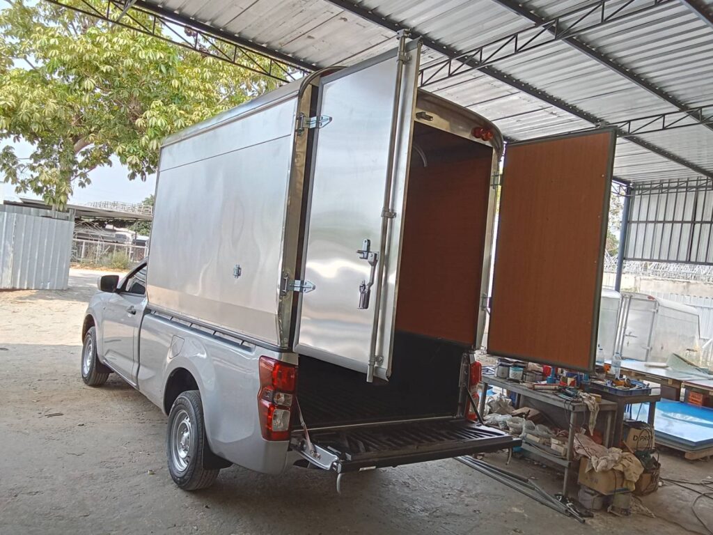 ความสูงวัดจากพื้นกระบะถึงหลังคาบนสุด 2.10 เมตร หลังคาเป็นทรงโค้ง สูงจากพื้นดิน 2.90 เมตร ควมกว้าง 1.70 เมตร ความยาวตามขนาดของกระบะรถ 2.40 เมตร และมีช่องเก็บของบนหัวเก๋งยาวไปด้านหน้าถึงกระจกหน้ารถ 1.0 เมตร โครงสร้างทั่วไปเป็นเหล็กแป้บทำสีบรอนด์ หุ้มด้านนอกด้วยแผ่นอลูมิเนียมหนา 0.70 มิลลิเมตร ไม่บุด้านใน ประตูท้ายเปิดออกด้านข้าง ซ้าย ขวา ไฟท้ายตู้ตามขนส่งกำหนด เป็นไฟหลี่ ไฟเลี้ยว ผลิตตามความต้องการของลูกค้า ติดตั้งกับรถกระบะ โตโยต้า รีโว่ ตอนเดียว