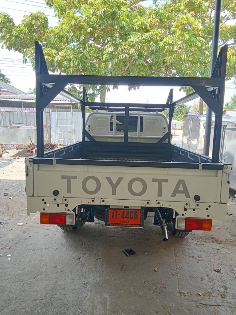 คอกบรรทุกเหล็ก  รับน้ำหนัก 4 ตัน โครงสร้างเป็นเหล็กรางน้ำ 3 นิ้ว ทำสีดำ ยึดติดกับกระบะพื้นเรียบ